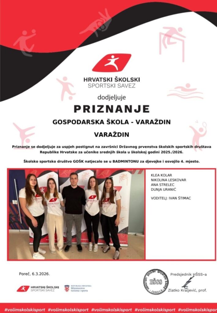 Članice ekipe školskog sportskog društva GOŠK u badmintonu u sastavu: Klea Kolar, Nikolina Leskovar, Ana Strelec te Dunja Uranić, kao prvakinje SŠ-a Varaždinske županije sudjelovale su na završnici Državnog prvenstva Republike Hrvatske.