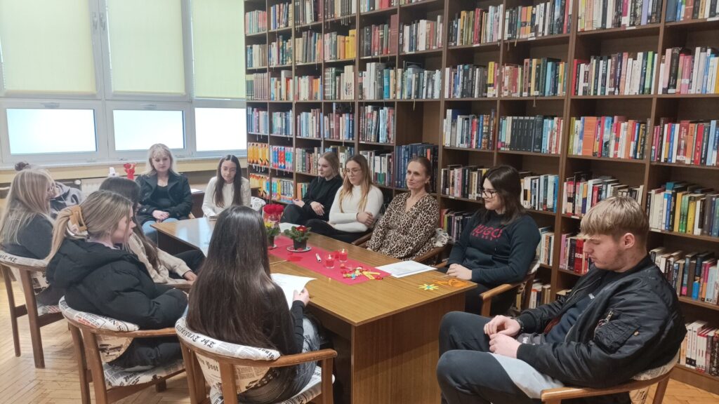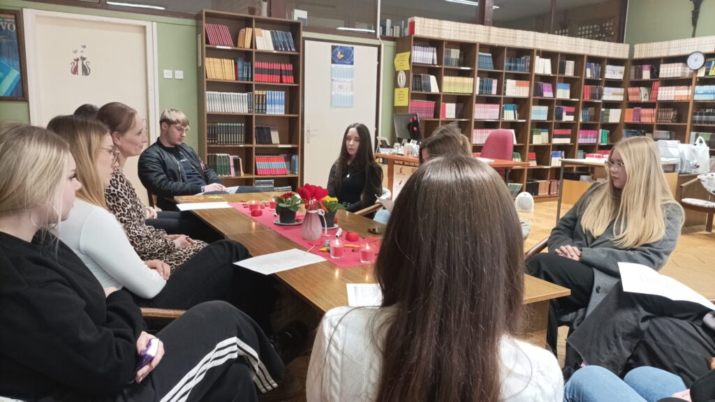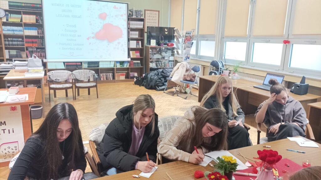 Posebno zadovoljstvo bilo nam je ugostiti učenice Srednje strukovne škole sa svojom knjižničarkom, koje su zajedno s učenicama 3. a razreda sudjelovale u čitanju pjesama i aktivnostima programa. Program je bio osmišljen u nekoliko dijelova – od zajedničkog čitanja pjesama, preko aktivnosti u kojoj su učenice nasumično izvlačile stihove iz zbirke i razgovarale o njima, do kratkog poetskog izazova u kojem su imale priliku zapisati vlastite misli i osjećaje.